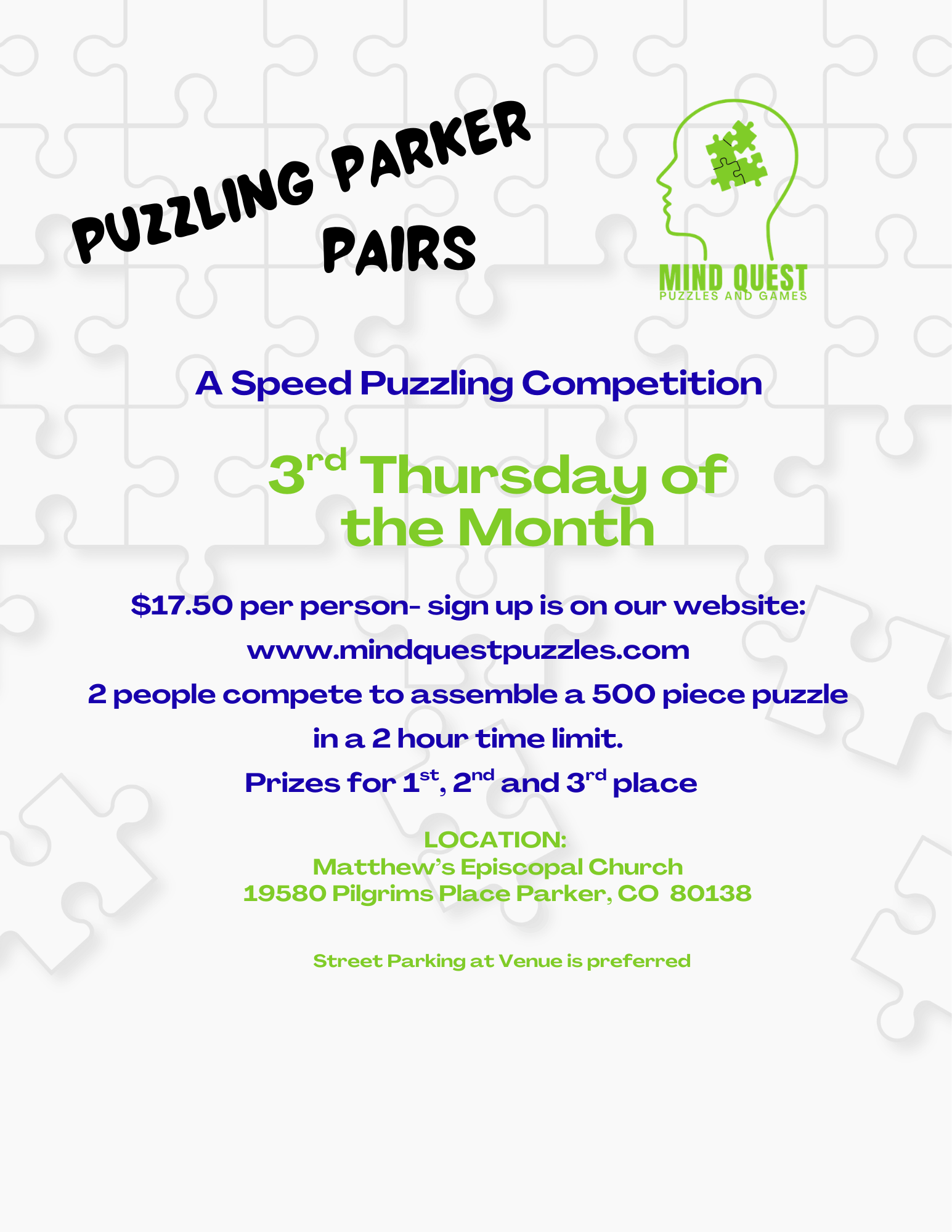 Parker Pairs is a speed puzzling event for puzzle enthusiasts of all ages! Puzzles will feature family friendly images, up to 2 people for each pair. Contestants will have 2 hours to complete their puzzle.